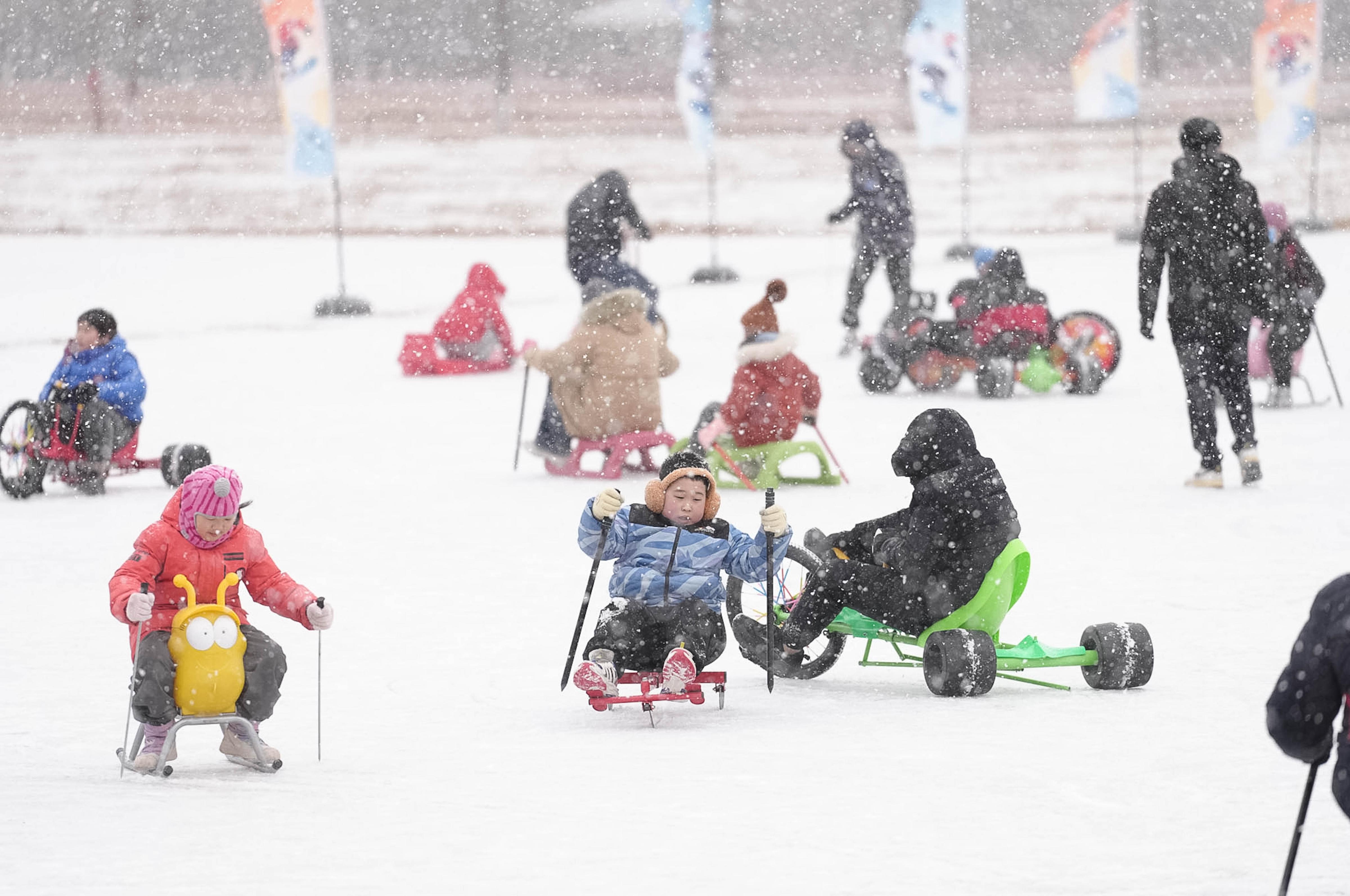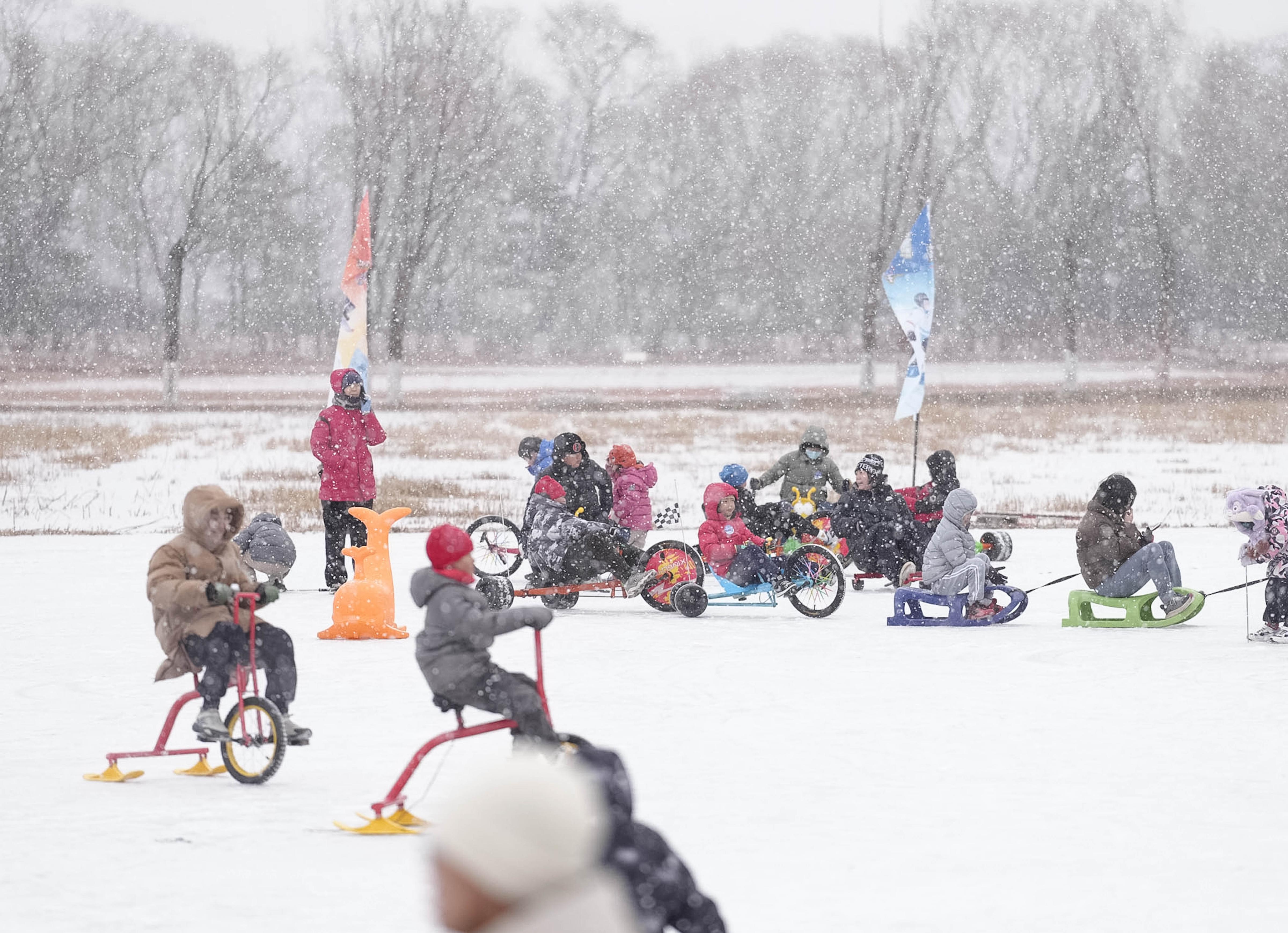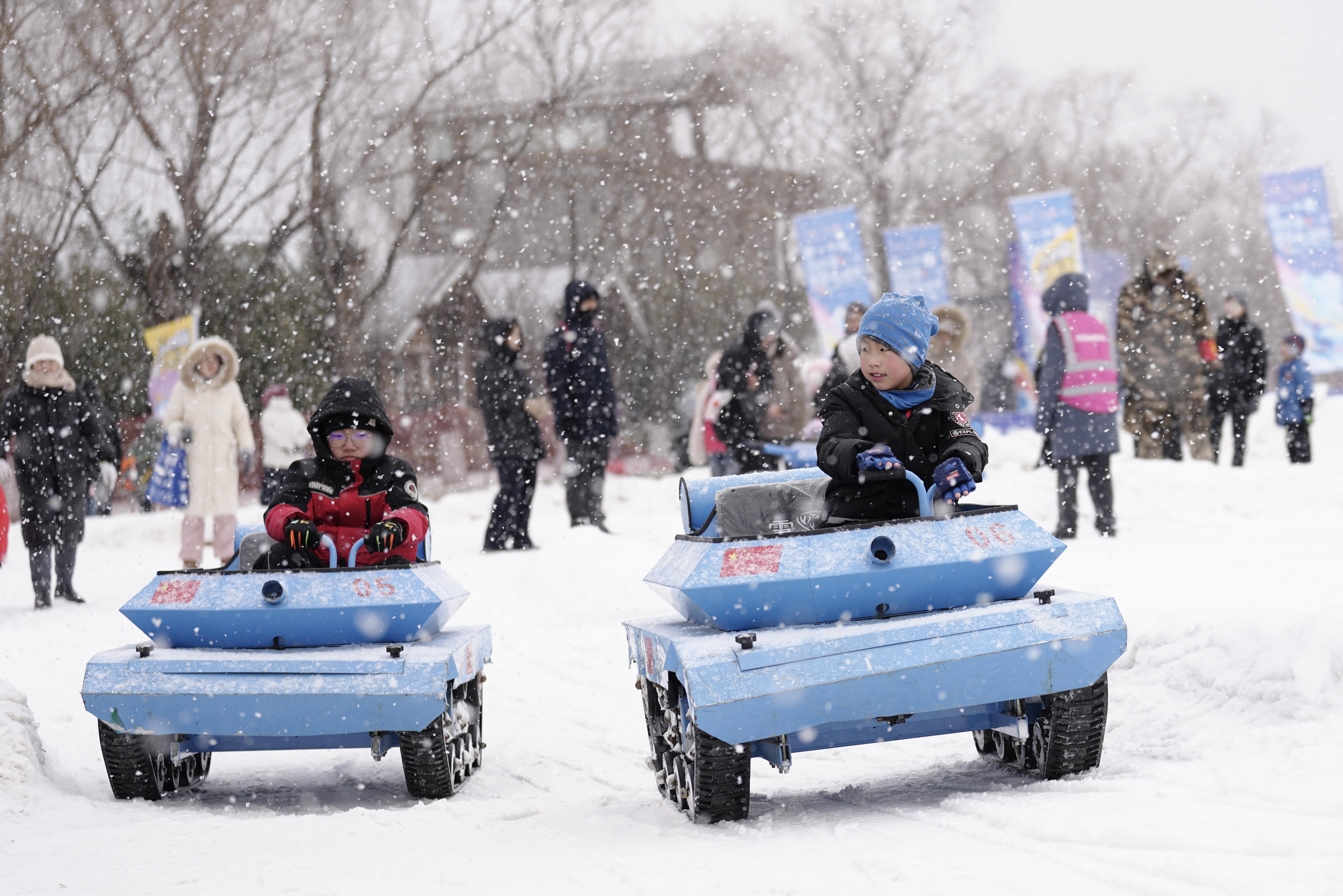 1月17日,雪花纷飞中,第十一届丰台区餍足冰雪季在北京园博园运行。