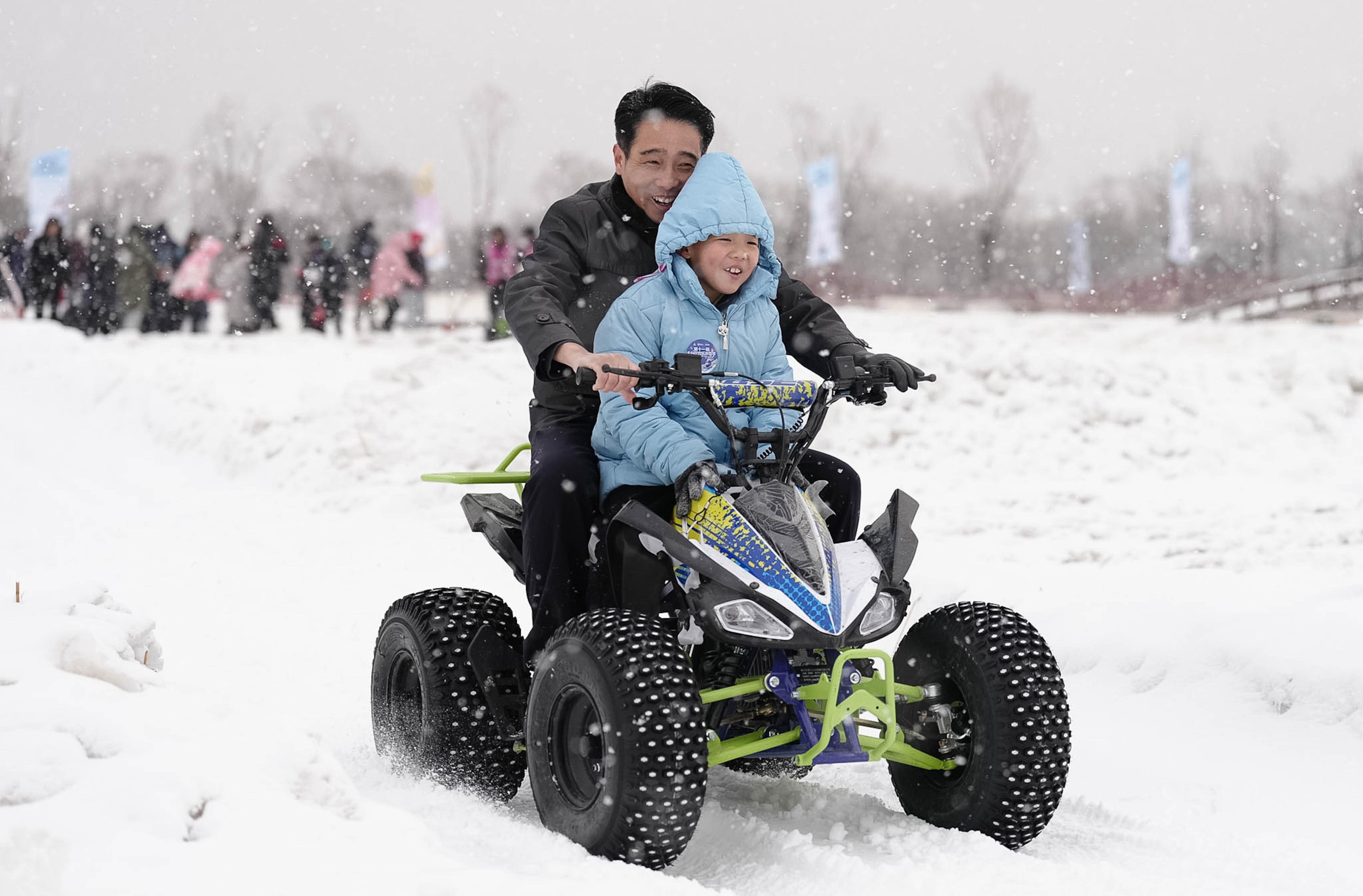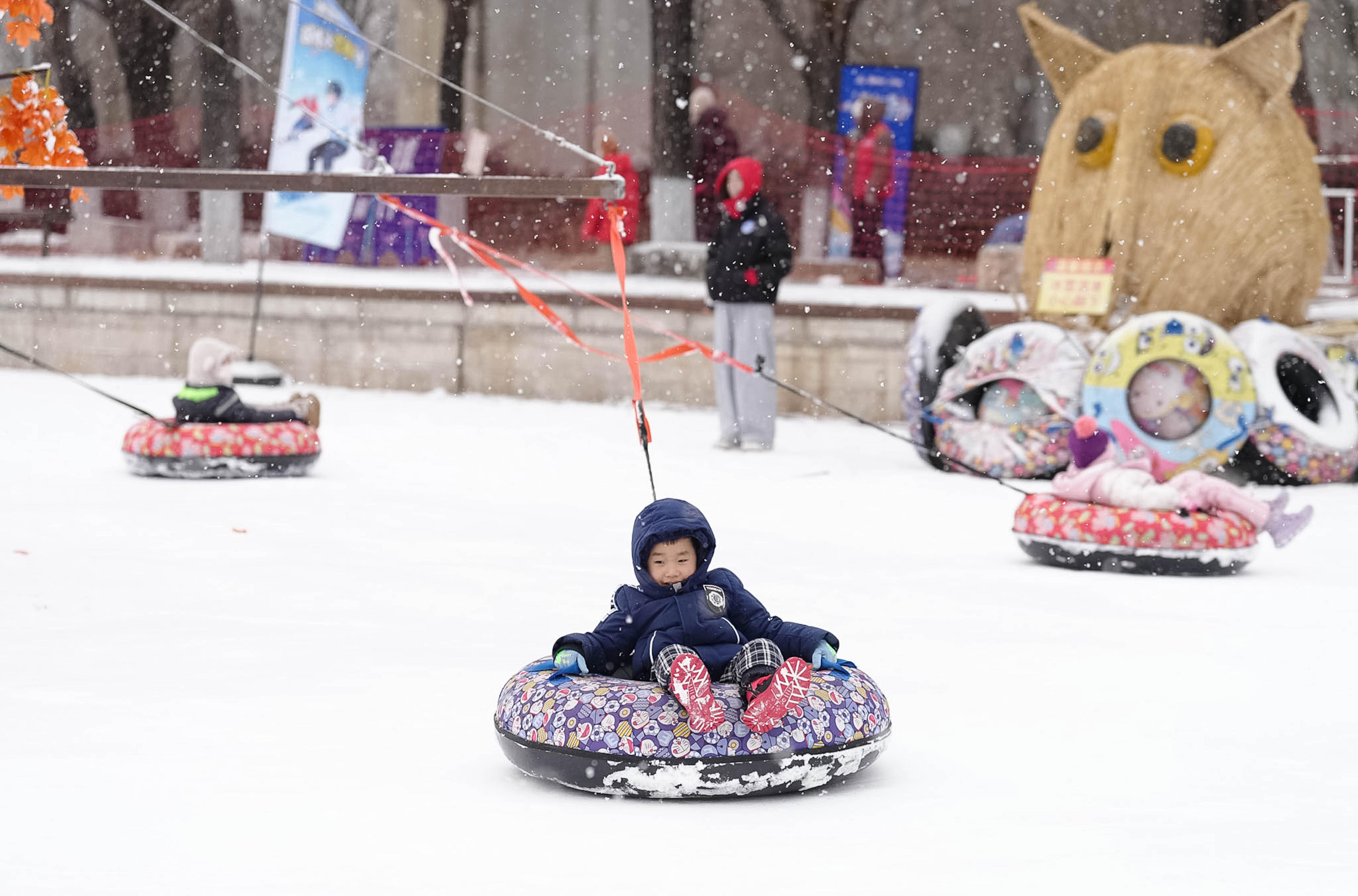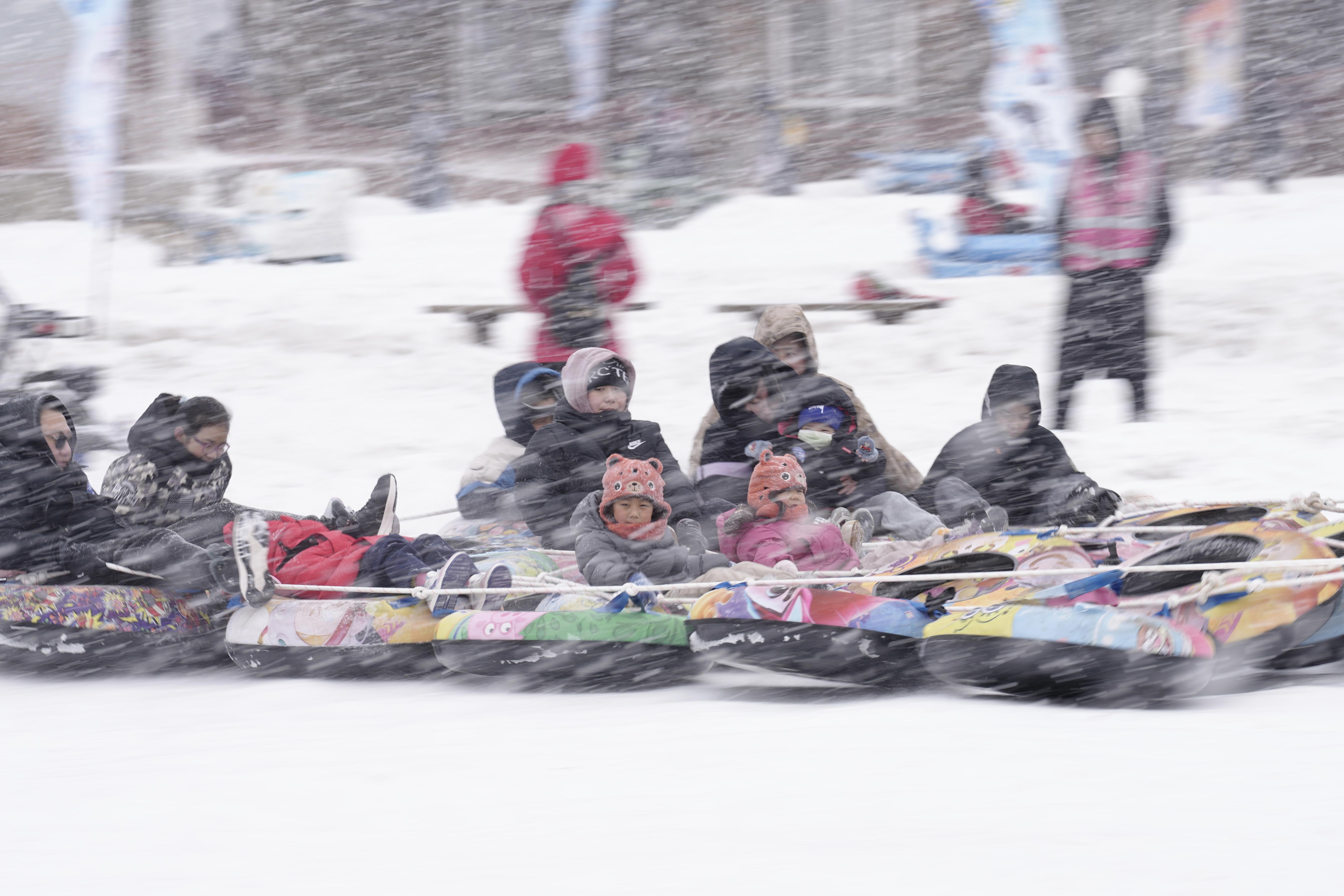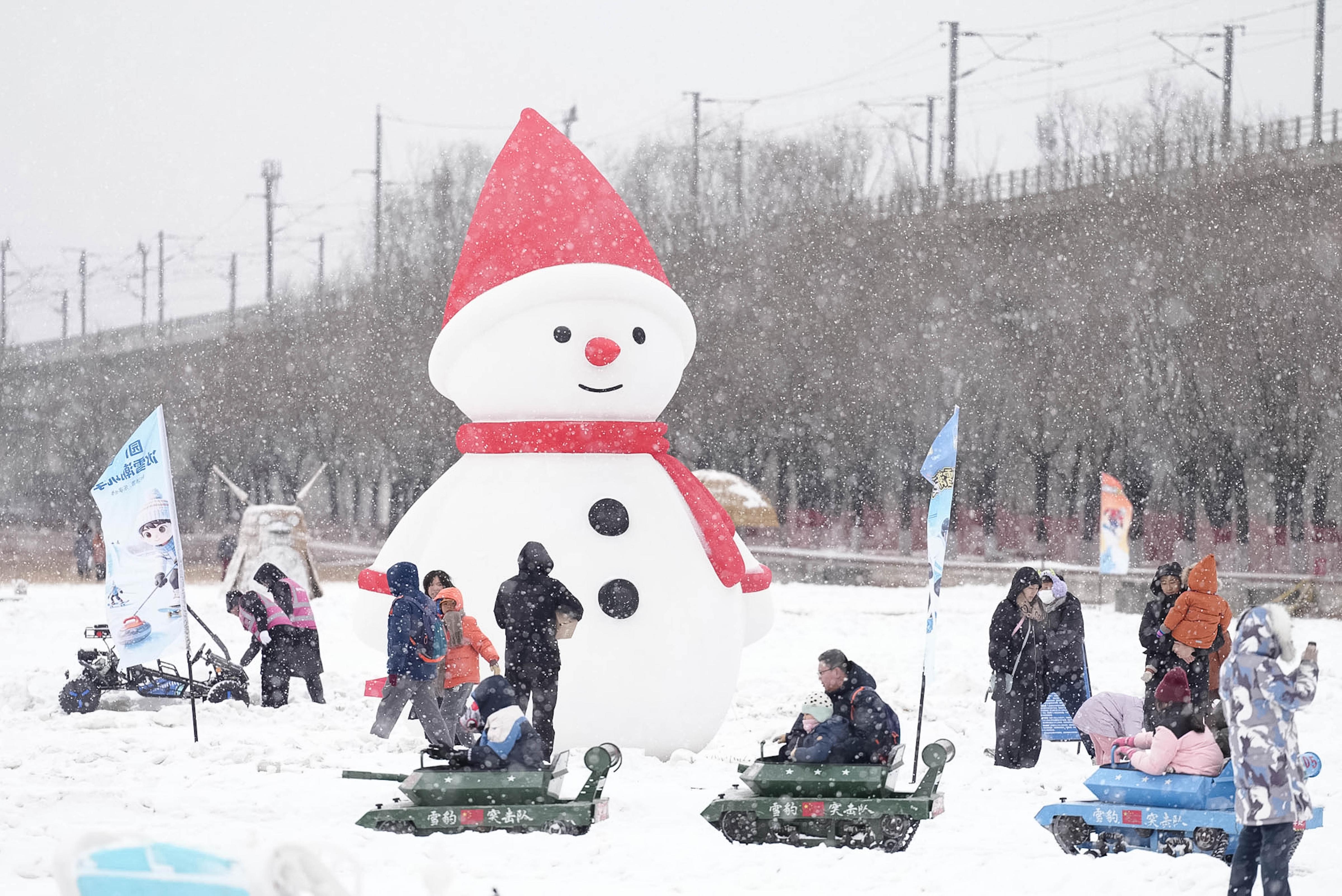 1月17日,雪花纷飞中,第十一届丰台区餍足冰雪季在北京园博园运行。